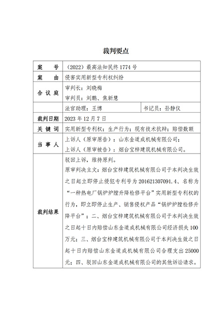 山東金道成機械有限公司于2021年11月26日立案起訴煙臺寶梓建筑機械有限公司侵犯“鍋爐爐膛檢修升降平臺”的專利權一案,經過一審、二審法院2年零11天的審查,于2023年12月07日,中華人民共和國最高人民法院做出(2022)最高法知民終1774號的終審判決: